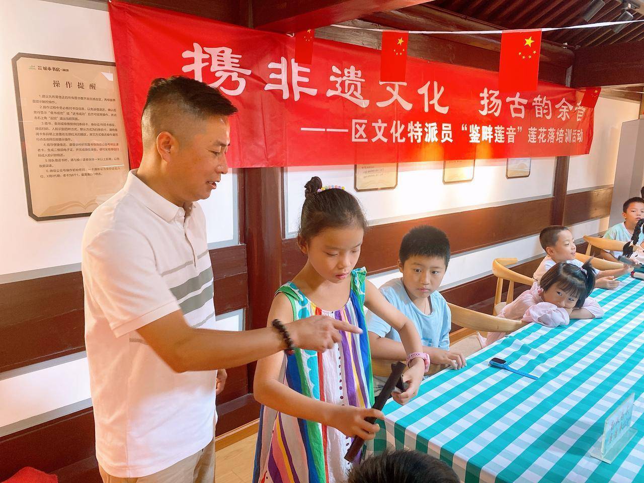 履职湖塘街道文化特派员后,徐兴祥牵头联动街道各文化礼堂,构建起非遗传承“鉴畔莲音”项目,开设公益课堂,丰富孩子们的课余生活。每期课程结束,街道还协助组织成果汇演,孩子们穿上演出服,登台展示所学。