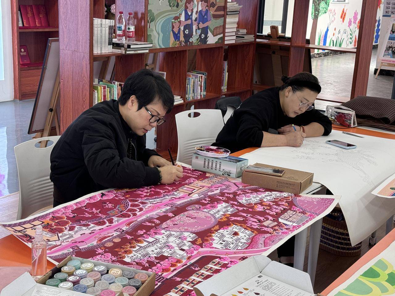 南亚萍(右)和村民共同在枢里村农家书屋绘画。新华每日电讯记者邱犇摄把产业写成歌