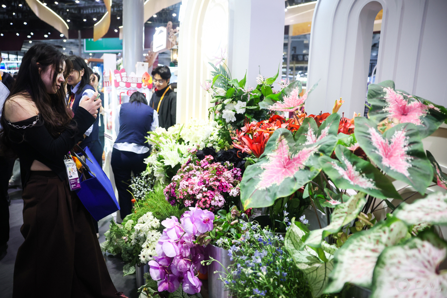 展台内布置了多品种的绿植和鲜花。